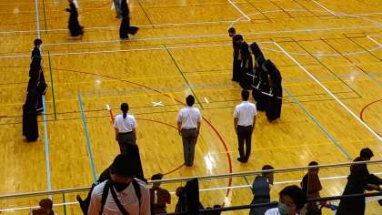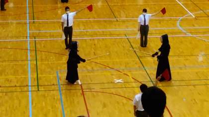 二回戦は、先鋒戦を取られ、中堅戦で追い付き、副将戦でリードしました。しかし大将戦では、打突の後に姿勢が崩れ、そこを打たれて先行され、追い付かれました。苦しい展開の中、最後は相手の思いきりのよさにもう一本を取られ、敗戦となりました。