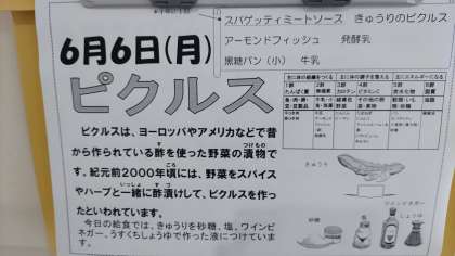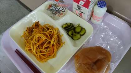 今日の給食は、スパゲッティミートソース、きゅうりのピクルス、アーモンドフィッシュ、発酵乳、黒糖パン、牛乳でした。