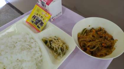 マーボーはるさめは、見た目からボリューム満点です。ご飯が進みそうですね。チンゲンサイともやしの甘酢あえは、火が通っていながら、しっかり食感も残っています。おいしく食べて、午後の授業も頑張りましょう!