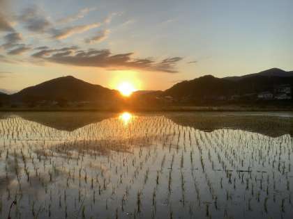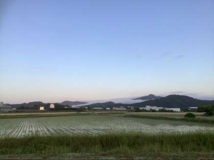水田に写る山の景色とともに、2つの太陽が現れたような美しい日の出を見ることができました。朝霧が晴れていきます。今日の美浜町の天気予報は晴れ!最低気温19度、最高気温26度、午前中の降水確率0%。加賀市山代温泉の天気予報も晴れ!最低気温13度、最高気温23度、午後の降水確率は10%。