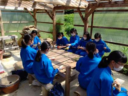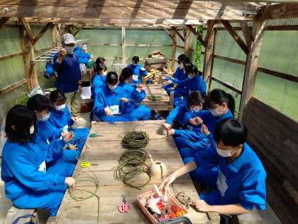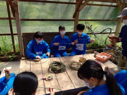 「つる細工作り体験」班は「葛藤の蔓」を使って籠を作っています。