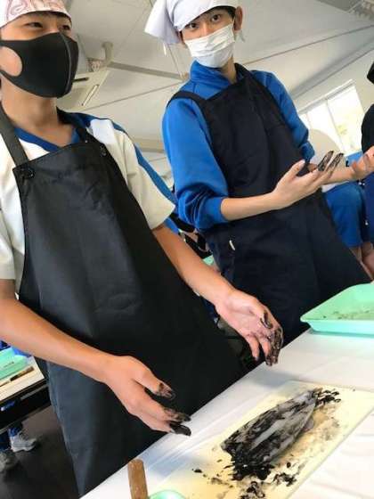 「魚さばき班」は、刺身グループは「烏賊」、焼き魚グループは「鯵と烏賊」、あら汁グループは「カワハギ」相手に苦戦しております。