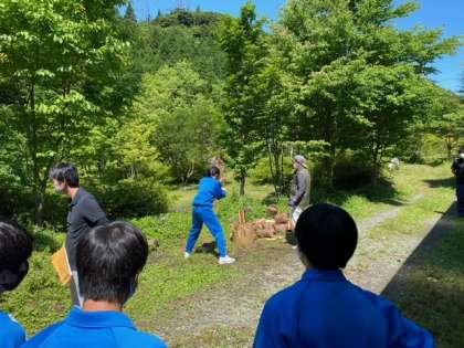 「薪割り・ピザ作り体験」班は、初めての薪割り、貴重な体験をさせて頂いています!