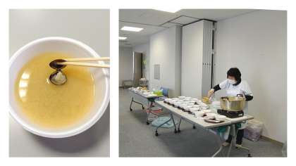 しじみ漁体験を終えた生徒は、体育館に戻り担当の方が事前に作って頂いていたしじみのお味噌汁を食べております。