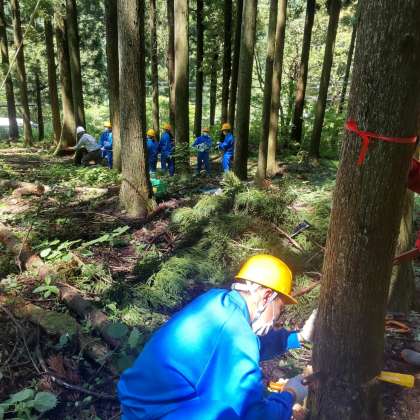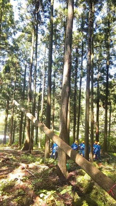 疲れたら交代しながら切り進め、最後はロープを引っ張って倒しました。