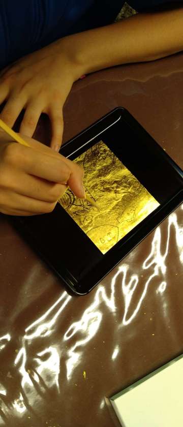 金箔を削りながら、模様を描いていきます!