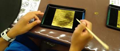 ゆのくにの森、伝統工芸体験「金箔貼り体験」前半グループの様子です。