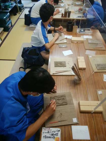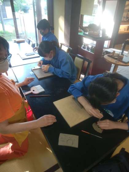 無地陶板後半組、仕上げにかかっています。紐を通して飾ることが出来るように、穴を空けている生徒もいます。