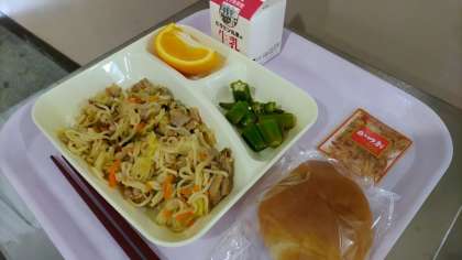 今日の給食は、和風焼きそば、オクラの甘酢あえ、オレンジ、黒糖パン(小)、牛乳でした。