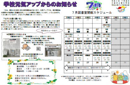 7月は、夏休みを目前に控え期末懇談会があります。元気アップでは、期末懇談会の期間中の放課後に図書室を涼しくして2時間ほど開放しています。いろんな本がたくさん揃っているので、どなたでも気軽に使ってください。