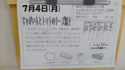 今日の給食は、鶏肉とてぼ豆のスープ煮、ジャガイモとトマトのチーズ焼き、もやしとコーンのソテー、おさつパン、牛乳です。