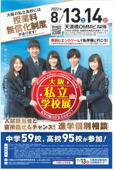 大阪の私立中学校・高等学校(全日制)が一堂に会し、学校紹介や進学相談等を行う「2023年入試 大阪私立学校展」が、大阪私立中学校高等学校連合会の主催で以下のとおり開催されますので、お知らせします。