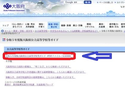【参考】大阪府 ホーム > 教育・学校・青少年 > 公立高等学校 > 中学生のみなさんへ(入試情報・学校説明会など) > 令和5年度版大阪府公立高等学校等ガイド(こちらをクリック)
