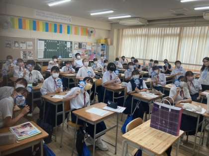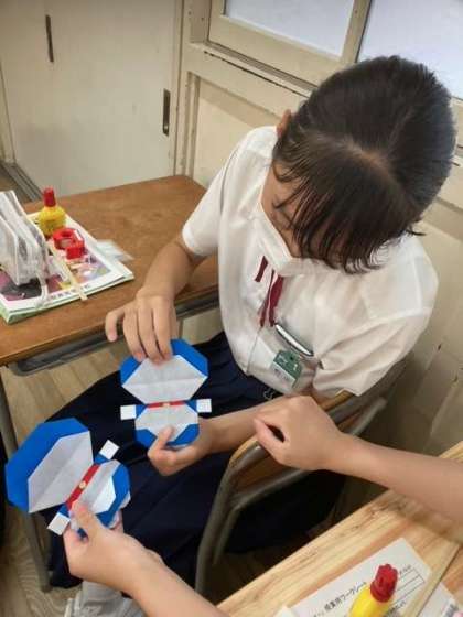 宣真高等学校の先生による「保育士講座」の様子です。生徒たちは楽しみながら集中して折り紙での作品制作に取り組んでいます。