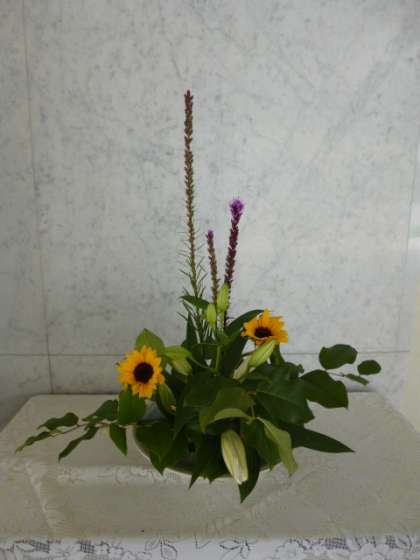 玄関ホールにあるお花は、学校支援ボランティアの中村さんが生けてくださっています。今回は、レモンリーフ・ひまわり・ユリ・むらさきの草(リアトリス)を使った作品です。