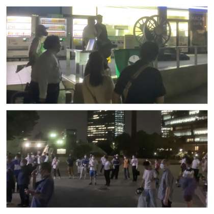 「中央区青少年指導員連絡協議会」と「『社会を明るくする運動』中央区推進委員会」主催で、大阪城公園合同夜間パトロールが行われました。いつもお世話になっている青少年指導員、青少年福祉委員、民生・児童委員、保護司・BBS、更生保護女性会、青少年補導員・東警察署、東中PTA、中央区地域女性団体協議会、区長さまはじめ区役所の皆さまによる合同パトロール。毎月25日は青少年指導員さんの活動日で7月25日は天神祭の日と重なり、花火を見ながらの巡視が恒例だったようですが、この3年は花火が自粛され、合同パトロールは3年ぶりの開催でした。