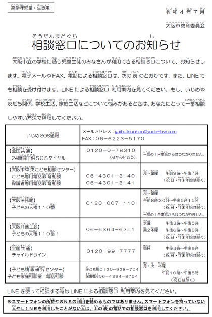 「相談窓口について」〜大阪市教育委員会からのお知らせ〜【再掲します】