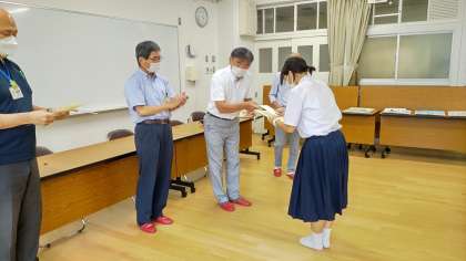 本日放課後、中央区長が来校され、「社会を明るくする運動」作文・ポスターコンクールの入賞者に直接賞状を渡して表彰してくださいました。