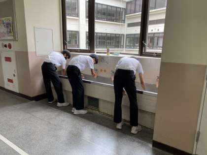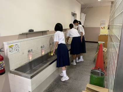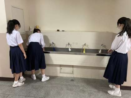 本日は、あいにくの雨模様だったので、校外での活動ができませんでした。しかし、部長たちが校内で気になる箇所を、自分たちで話し合うなかで、全フロアの手洗い場を綺麗に清掃しました!