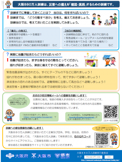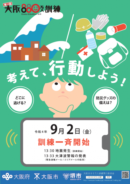 なお、ご連絡が直前になりましたこと、お詫びいたします。また、明日9月2日(金)13時30分に「大阪880万人訓練」が、災害への備えを「確認・実践」するために行われますので、ご承知ください。