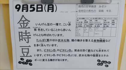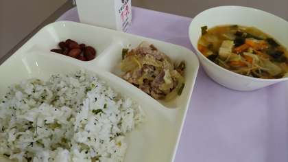 今日の給食は、豚肉の甘辛焼き、みそ汁、金時豆の煮物、菜飯、牛乳でした。
