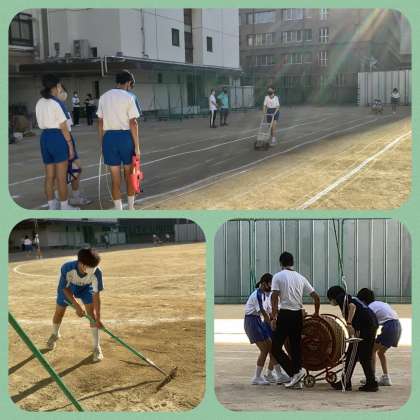 さて、体育大会実行委員会の取組も進み、練習に使う運動場に、手際良く、色分けされたラインが綺麗にひかれています。
