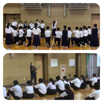 今朝の体育大会実行委員会の活動は、 グランドコンディションが悪いので、体育館で、全体練習に向けてのリハーサルを行い、動きの確認を行いました。