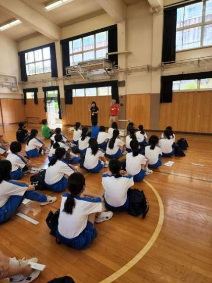南大江地域防災訓練が始まりました。生徒の参加は3年ぶりで、全員が初参加です。参加している生徒のうち、吹奏楽部は、まずは救護訓練の練習からです。