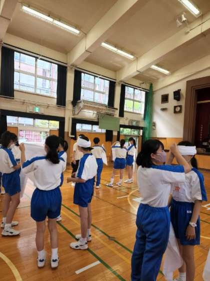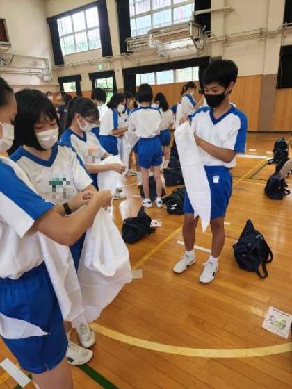 三角巾を包帯にように使うことができるようになる練習です。包帯のように使えるようになったら頭に巻きます。