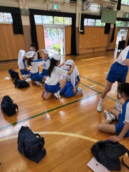 救護訓練の最後には、包帯替わりの三角巾を使って、頭全体の巻き方を実践しました。