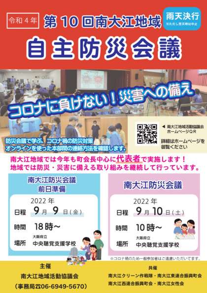 東中学校が立地する南大江地域で、自主防災会議・訓練が、今年は町会長の皆さま中心とする代表の方々等で、次の通り実施されます。この間、南大江地域では防災・災害に備える取り組みを継続して行われており、今年は10回を迎えます。