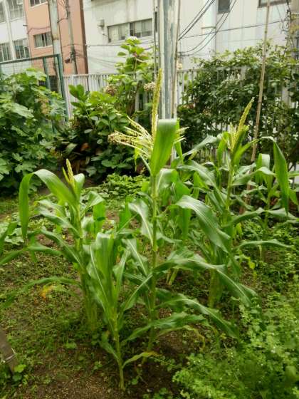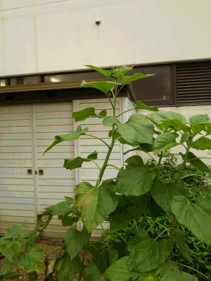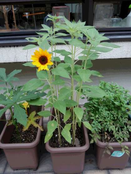 中庭のひまわりの花が咲きました。裏庭のひまわりとトウモロコシは先日のゲリラ豪雨で一旦倒れてしまいましたが、見事に復活しています。