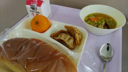 今日の給食は、あげぎょうざ、鶏肉ととうがんの中華煮、冷凍ミカン、黒糖パン、牛乳です。
