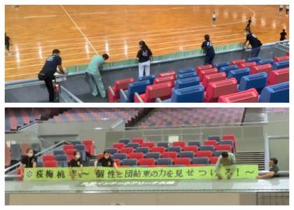 第35回体育大会の朝を迎えました。会場の丸善インテックアリーナ大阪では、体育大会実行委員会、PTA役員の皆さんと会場設営を急ピッチで進めています。皆さんありがとうございます!