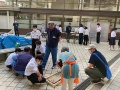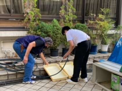 秋の種花事業で、大阪市中央区役所市民協働課、大阪城公園事務局、地域のボランティアの方々にお越しいただきました。花の種が流れていかないように、大きいバットを使って底面吸水を行います。