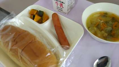 今日の給食は、ウインナーのケチャップソース、スープ、焼きかぼちゃ、黒糖パン、牛乳です。