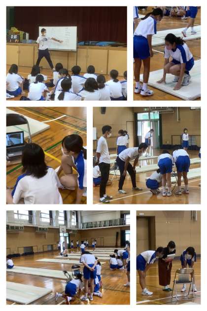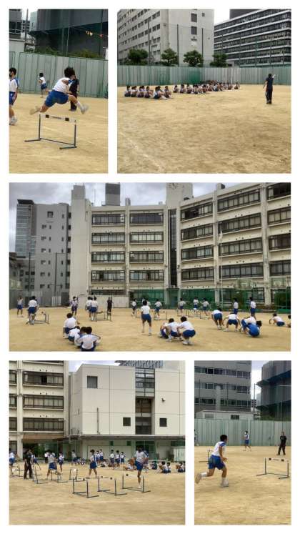 1年生の保健体育の授業です。男子は運動場でハードル走、女子は体育館でマット運動に取り組んでいます。マット運動では、タブレット端末の「追いかけ再生」機能を上手に使い、演技終了後にすぐに自分の演技の様子をタブレットで見ながら、仲間と良い点と改善点を確認し、次の練習に向かっていきます。東中では、ICT機器を授業でより効果的に使うための試行錯誤を重ねています。