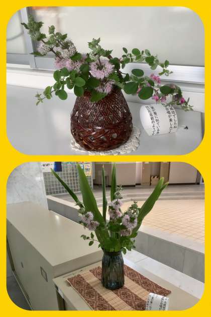 玄関ホールと職員室前のお花を生け替えていただきました。いつもありがとうございます。玄関ホールの花は「ジンジャーとタンギク」、職員室前のお花は「タンギクと萩」です。タンギクは葉が菊に似ているので、この名前が付いたようです。