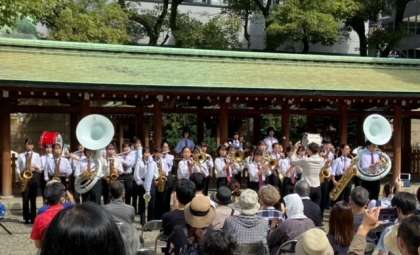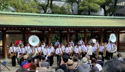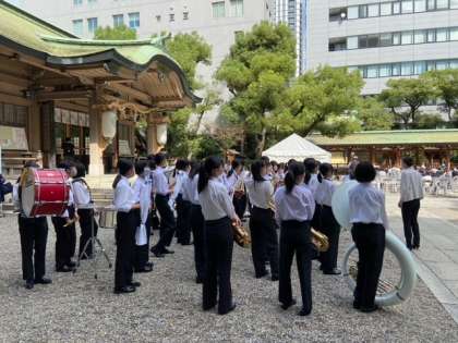本日、坐摩神社にて開催されている「せんば ざまさん音楽会」にて、吹奏楽部が演奏いたしました。