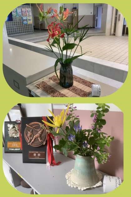 さて、先日、活け替えていただいた玄関のお花は「グロリオサ・やぶれがさ」、職員室前のお花は「きく・りんどう・萩」です。いつもありがとうございます。