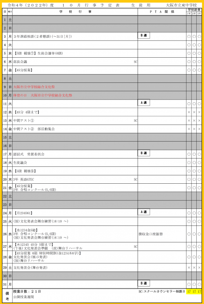 また、10月の行事予定表を再載します。主な予定は次の通りです。こちらをクリックするとご覧いただけます。