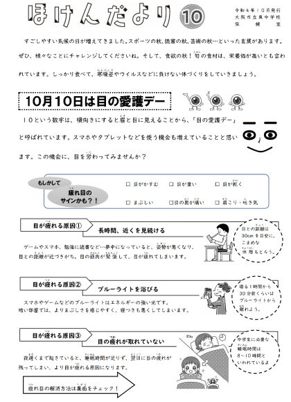 10月10日は「目の愛護デー」です。遅くなりましたがが、ほけんだより(10月号)(こちらをクリックするとご覧いただけます)を掲載します