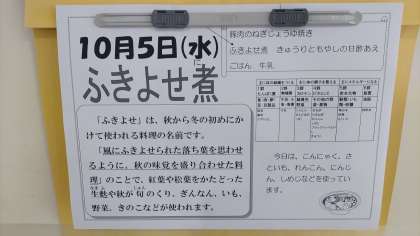 ふきよせ煮は、秋の味覚を盛り合わせた料理とのことですが、生麩、くり、ぎんなんが秋の味覚ながら、今日の給食には入っていませんでしたね。