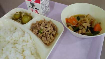 今日の給食は、豚肉のねぎじょうゆ焼き、ふきよせ煮、きゅうりともやしの甘酢あえ、ごはん、牛乳です。