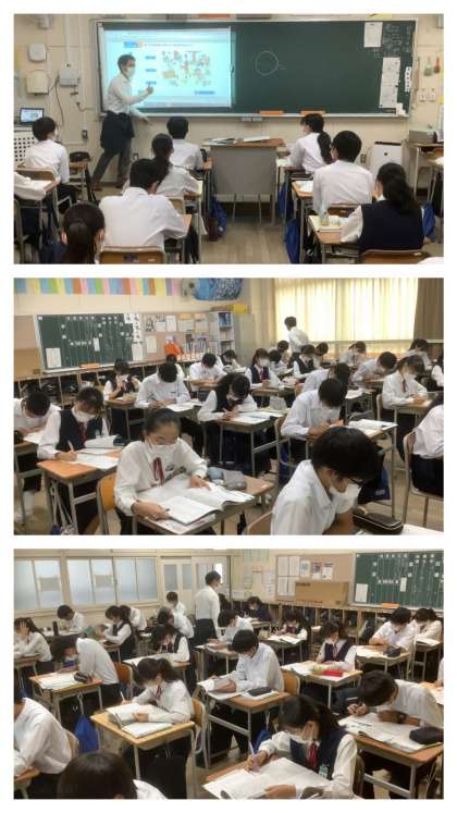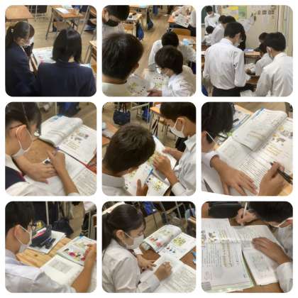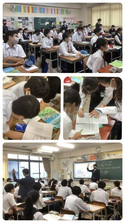 今日の授業公開は、3年生の英語。二人の先生の授業が、それぞれに公開されていました。グループ活動やペア学習を取り入れ、ICT機器を効果的に活用して、テンポ良く学習が進められています。「読む・聞く・話す・書く」の4つの技能をバランスよく習得できるように工夫されています。