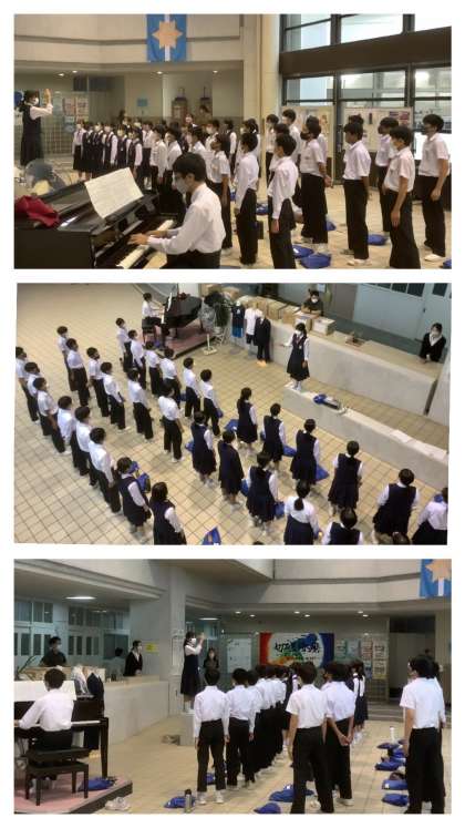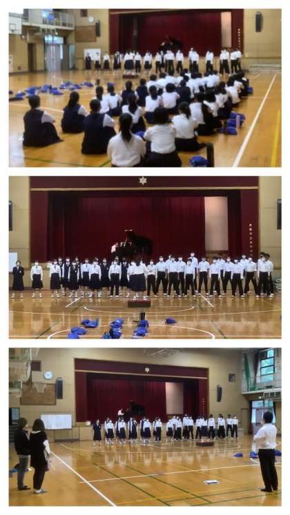 生徒たちの歌声が、校内に心地よく響き渡る1週間となりました(写真は2年生3クラスの練習風景です)。感染症対策を施しての合唱コンクール。マスクを着用し、フロアに並んでの合唱。鑑賞する生徒との距離もあけての実施です。まだまだ制限のある中での行事ですが、工夫を凝らして取組を進めています。