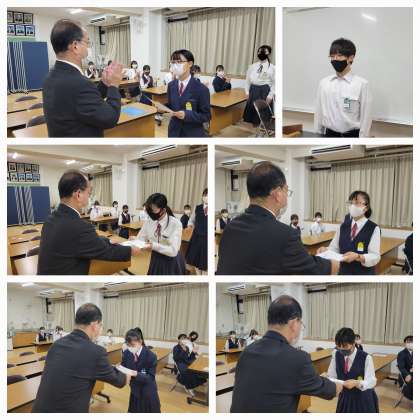 本日は、晴天の場合久しぶりにグラウンドでの全校集会を予定していたのですが残念ながらオンラインでの全校集会となりました。認証式があり後期生徒会と学級代表の人に認証状が手渡されました。