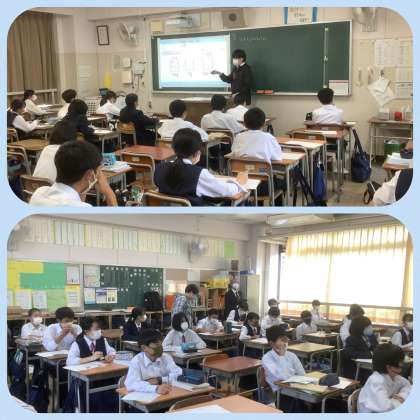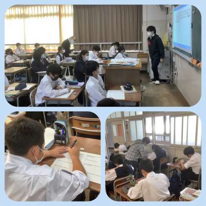 今日は、大学院から教授先生にお越しいただいての大学院生による公開授業がありました。1年生の数学、単元は「方程式の利用」。理科で学習した内容もふくまれており、カリキュラムマネジメントを意識した授業が展開されました。
