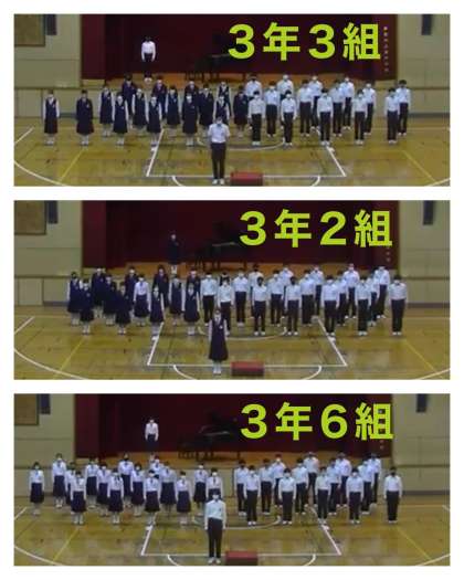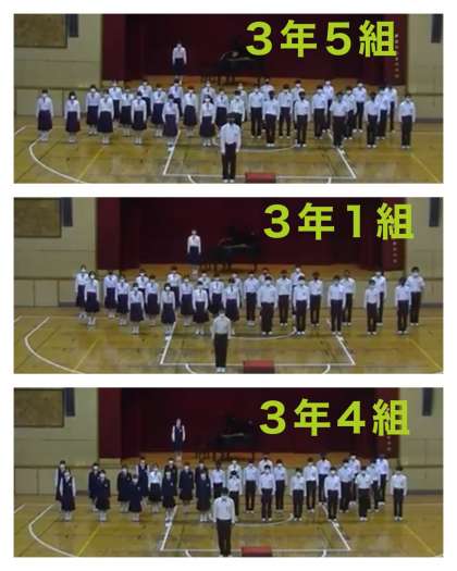 3年生の合唱コンクールが体育館で行われました。演奏順は5組→1組→4組→3組→2組→6組。素晴らしい歌声が体育館いっぱいに広がりました。