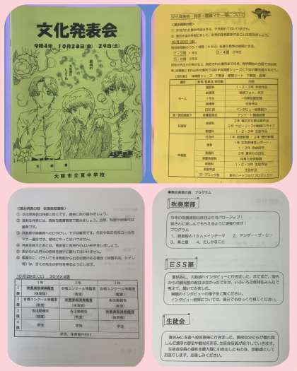 文化発表会が、28日(金)29日(土)に行われます。(先日、生徒を通じてお届けしたご案内はこちらをクリックしてご覧ください)。保護者の皆様には、生徒たちの展示発表をご覧いただけるように準備しております。お手数ですが、健康観察表(こちら)に必要事項を記入のうえ、ご持参ください。スムーズな受付にご理解とご協力をお願いします。